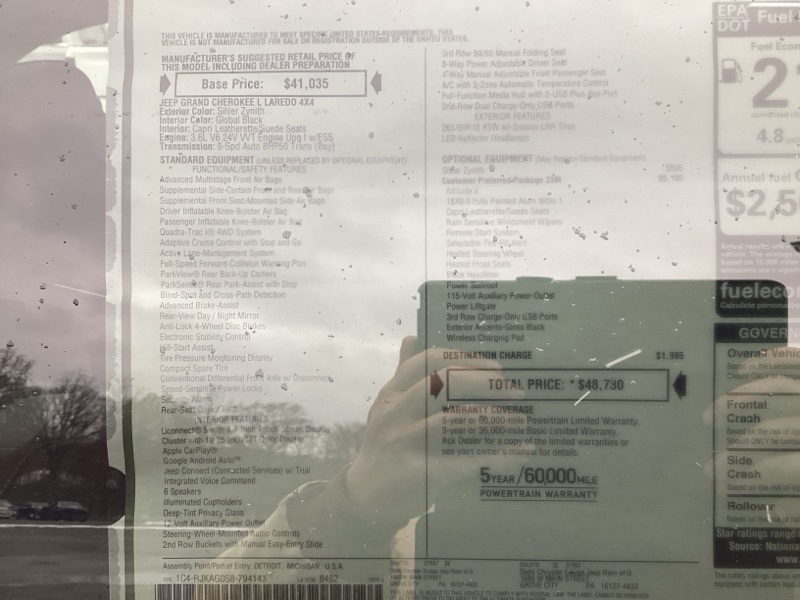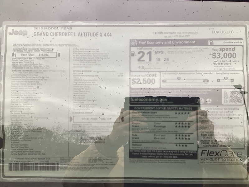 Silver Zynith 2025 Grand Cherokee L Jeep Altitude X 4D Sport Utility 4WD 8-Speed Automatic 3.6L V6 24V VVT Price includes: $1000 - 2025 National Stellantis Loyalty Bonus Cash . Exp. 03/31/2026 $2000 - 2025 National Bonus Cash . Exp. 03/31/2026 $2000 - 2025 National SFS Lease Loyalty Bonus Cash. Exp. 03/31/2026 $2500 - 2025 National Retail Bonus Cash . Exp. 03/31/2026 $500 - 2025 National 2025 First Responder Bonus Cash. Exp. 01/04/2027