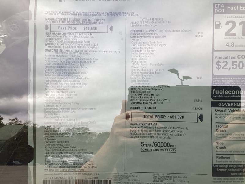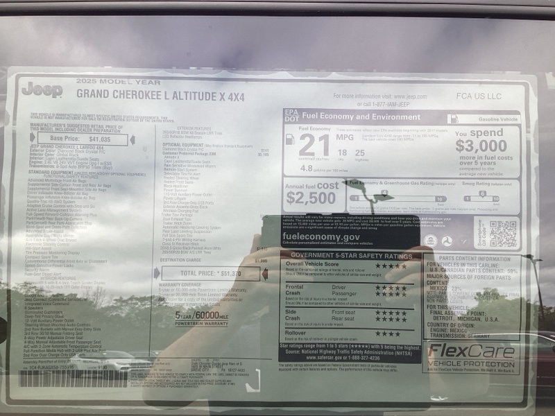 Diamond Black Crystal Pearlcoat 2025 Grand Cherokee L Jeep Altitude X 4D Sport Utility 4WD 8-Speed Automatic 3.6L V6 24V VVT Price includes: $1000 - 2025 National Stellantis Loyalty Bonus Cash . Exp. 03/31/2026 $2000 - 2025 National Bonus Cash . Exp. 03/31/2026 $2000 - 2025 National SFS Lease Loyalty Bonus Cash. Exp. 03/31/2026 $2500 - 2025 National Retail Bonus Cash . Exp. 03/31/2026 $500 - 2025 National 2025 First Responder Bonus Cash. Exp. 01/04/2027