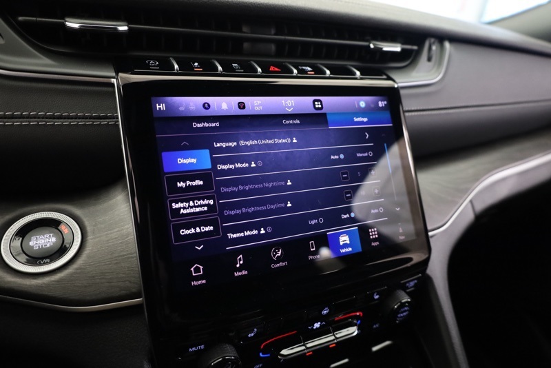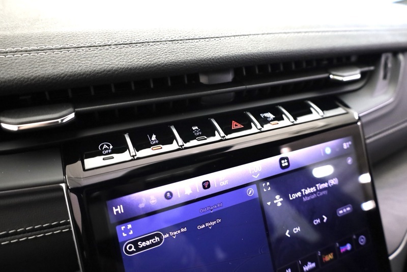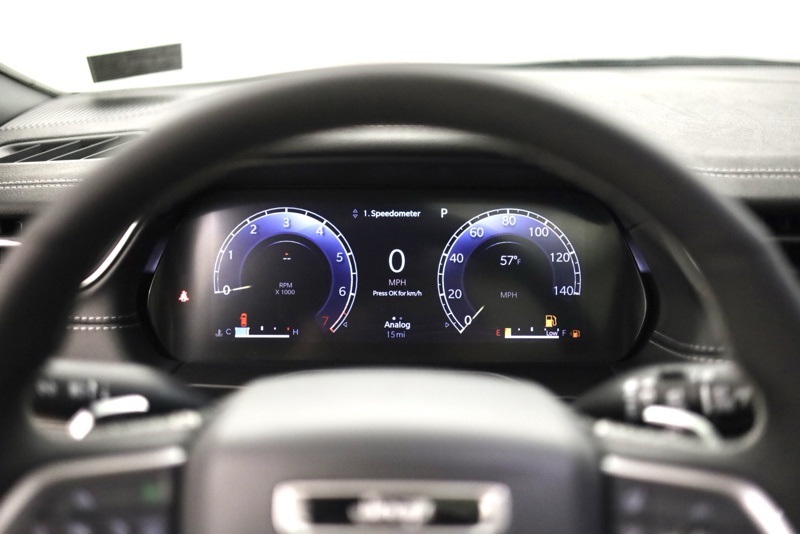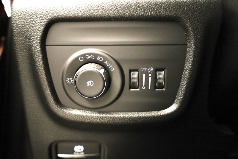 Technology is handled through **Uconnect 5 Nav with a 10.1" display**, built-in navigation, SiriusXM with 360L, audio memory, steering-wheel-mounted audio controls, compass, trip computer, tachometer, voltmeter, and outside temperature display. The **Active Noise Control System** helps maintain a quieter cabin, while auto high-beam headlights, fully automatic headlights, front fog lights, speed-sensitive wipers, and heated door mirrors with turn signal indicators support clear visibility.