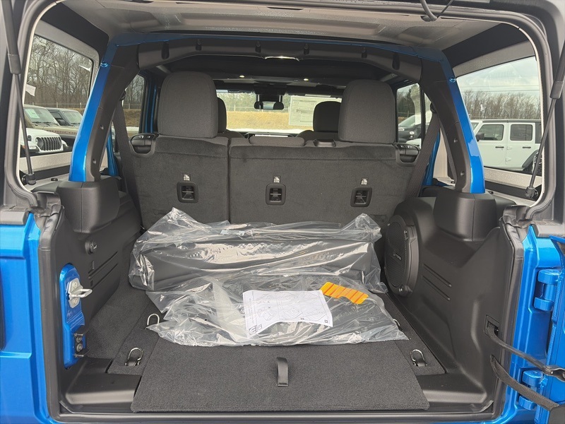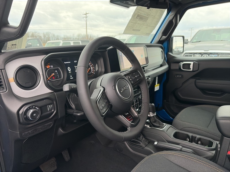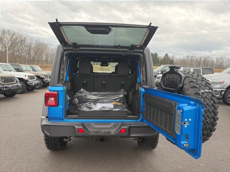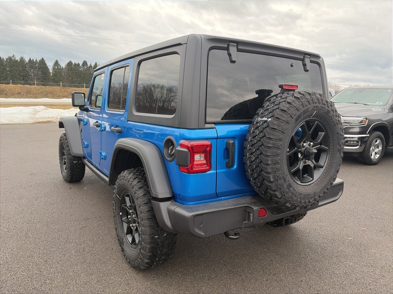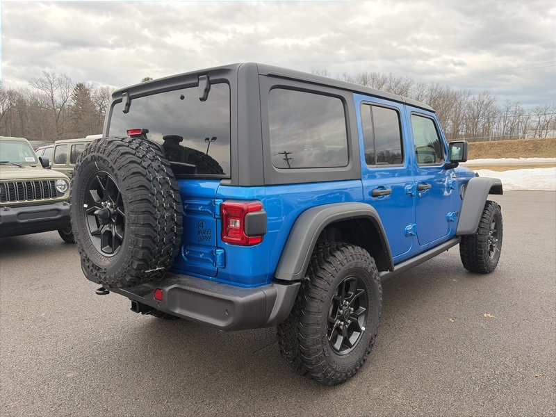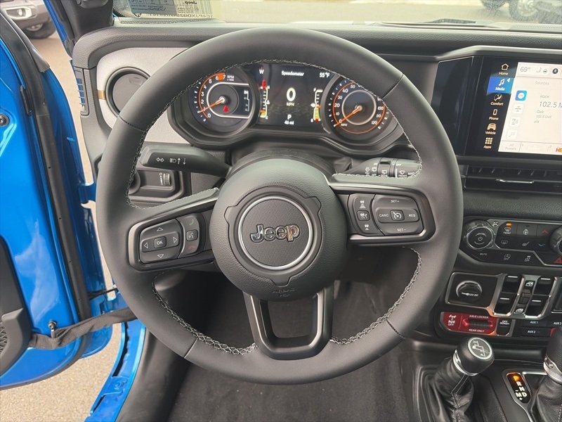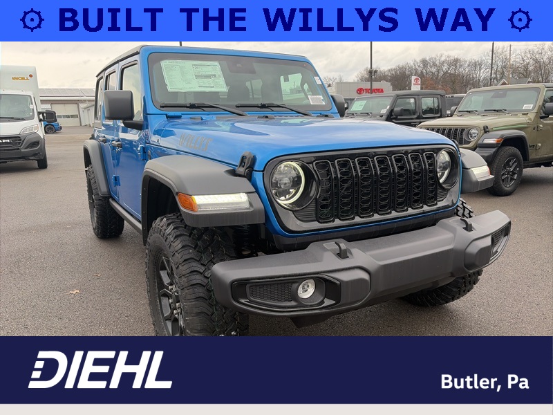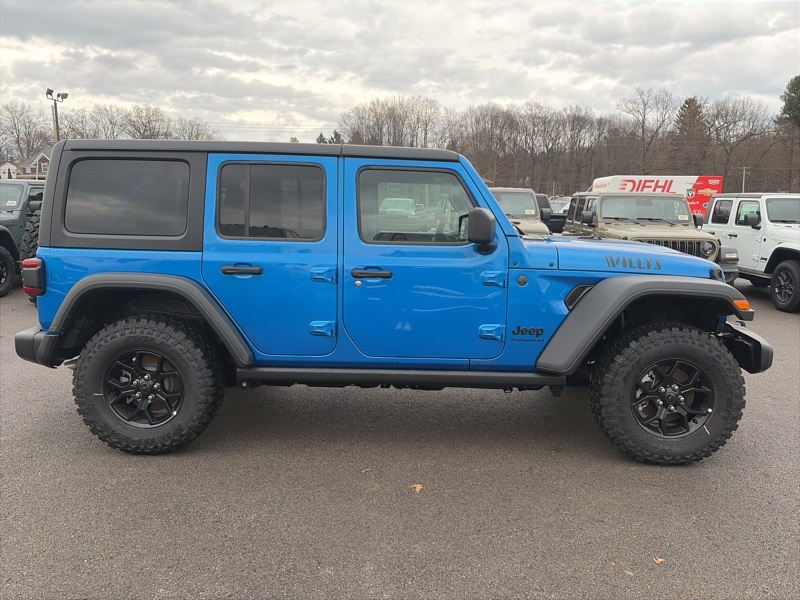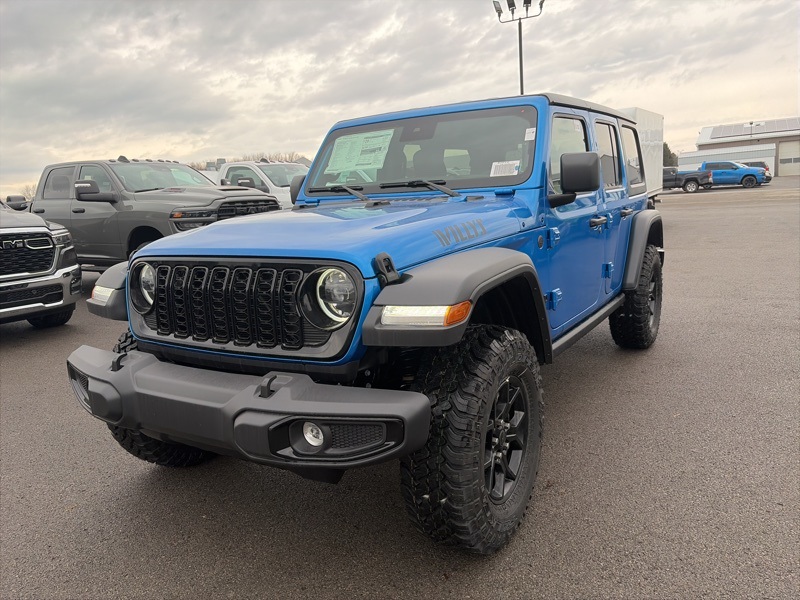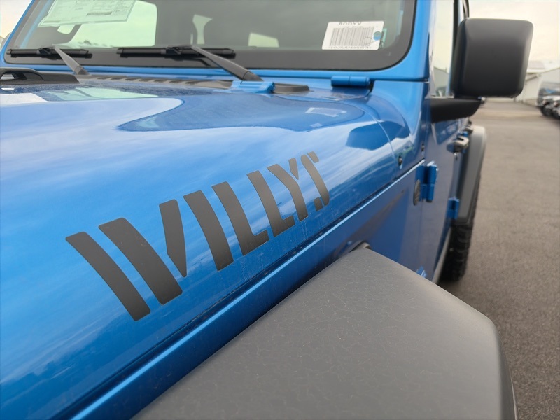 Convenience Group (2-Door Passive Entry, Front Door Locks, Air Conditioning w/Auto Temperature Control, Air Filtering, Cluster 7.0" TFT Color Display, Emergency/Assistance Call, Heated Front Seats, Heated Steering Wheel, Remote Start System, and Universal Garage Door Opener), Quick Order Package 24W Willys (4-Wheel Drive Swing Gate Decal, 7 & 4 Pin Wiring Harness, 97 MPH Vehicle Max Speed Calibration, Advanced Brake Assist, Automatic Headlamps, Auxiliary Switches, Black Grille, Class II Receiver Hitch, Conventional Differential Front Axle, Corning Gorilla Glass, Dana M210 Wide HD Tube Front Axle, Dana M220 Wide Rear Axle, Daytime Running Lamps LED Accents, Deep Tint Sunscreen Windows, E-Locker Rear Axle, Enhanced Adaptive Cruise Control, Front LED Fog Lamps, Full Speed Forward Collision Warning Plus, Injection Molded Black Rear Bumper, LED Premium Reflector Headlamps, Mold In Color Bumper w/Gloss Black, Molded in Color Rubicon Highline Flare, MOPAR All-Weather Floor Mats, Off-Road Plus Mode, Power Heated Mirrors, Premium Wrapped Steering Wheel, Security Alarm, Sun Visors w/Illuminated Vanity Mirrors, Wheels: 17" x 7.5" Painted Black, Willy's Suspension, and Willys Hood Decal), Safety Group (Auto High Beam Headlamp Control, Blind Spot & Cross Path Detection, LED Taillamps, and ParkSense Rear Park Assist System), 110 MPH Vehicle Max Speed Calibration, 4-Wheel Disc Brakes, 8 Speakers, ABS brakes, Air Conditioning, Alpine Premium Audio System, AM/FM radio: SiriusXM, Apple CarPlay/Android Auto, Aux Battery, Black 3-Piece Hard Top, Brake assist, Cloth Low-Back Bucket Seats, Compass, Delay-off headlights, Driver door bin, Driver vanity mirror, Dual front impact airbags, Dual front side impact airbags, Electronic Stability Control, Freedom Panel Storage Bag, Front anti-roll bar, Front Bucket Seats, Front Center Armrest w/Storage, Front fog lights, Front reading lights, Illuminated entry, Integrated roll-over protection, Low tire pressure warning, MOPAR Hardtop Headliner, Non-Lock Fuel Cap w/o Discriminator, Normal Duty Suspension, Occupant sensing airbag, Outside temperature display, Overhead airbag, Panic alarm, ParkView Rear Back-Up Camera, Passenger door bin, Passenger vanity mirror, Power steering, Power windows, Radio data system, Radio: Uconnect 5 w/12.3" Display, Rear anti-roll bar, Rear reading lights, Rear Window Defroster, Rear Window Wiper/Washer, Remote keyless entry, Speed control, Split folding rear seat, Steering wheel mounted audio controls, Stop-Start Dual Battery System, Tachometer, Telescoping steering wheel, Tilt steering wheel, Traction control, Trip computer, Variably intermittent wipers, and Wheels: 17" x 7.5" Black Steel Styled. Hydro Blue Pearl Coat 2025 Jeep Wrangler Willys 4WD 8-Speed Automatic 3.6L V6 24V VVT