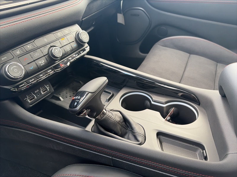 Equipped with the Blacktop Redline Package, it features gloss black exterior accents, a black Dodge grille badge, gloss black mirrors, black roof rails with integrated crossbars, a performance lower splitter, satin black tail lamp badge, and an SRT rear spoiler. Inside, the cabin is finished with Blacktop leather SRT performance seats with red accent stitching, ventilated front seats, heated second row seats, fold and tumble second row captain chairs with a mini console and cupholders, a third row mini console and floor mat, premium door trim, and a premium instrument panel. Six passenger seating keeps the layout sporty and functional.