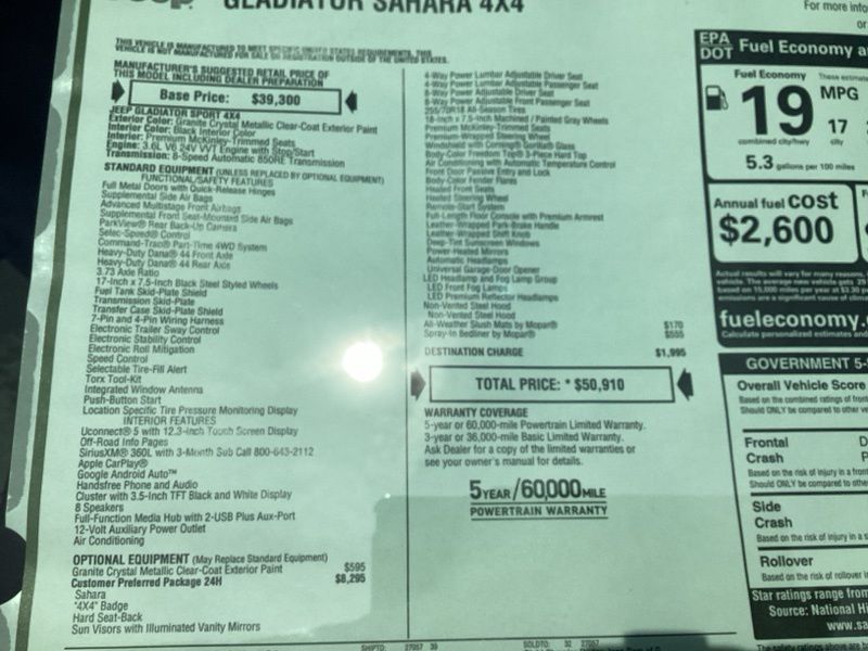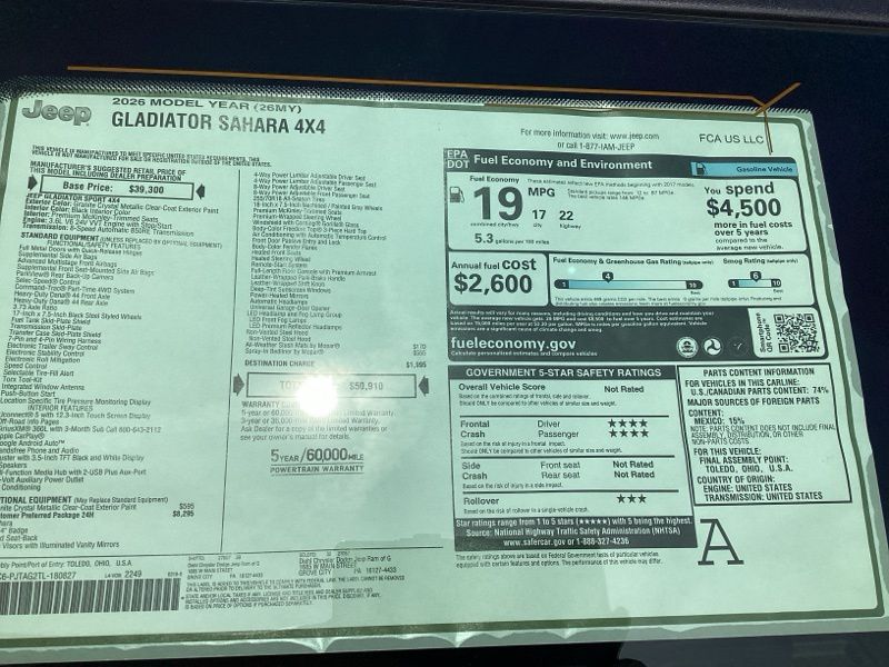 Granite Crystal Metallic Clearcoat 2026 Gladiator Jeep Sahara 4D Crew Cab 4WD 8-Speed Automatic 3.6L V6 24V VVT Price includes: $1000 - 2026 National Retail Bonus Cash . Exp. 04/30/2026 $1000 - 2026 National Stellantis Loyalty Bonus Cash . Exp. 04/30/2026 $500 - 2026 National 2026 First Responder Bonus Cash . Exp. 01/04/2027