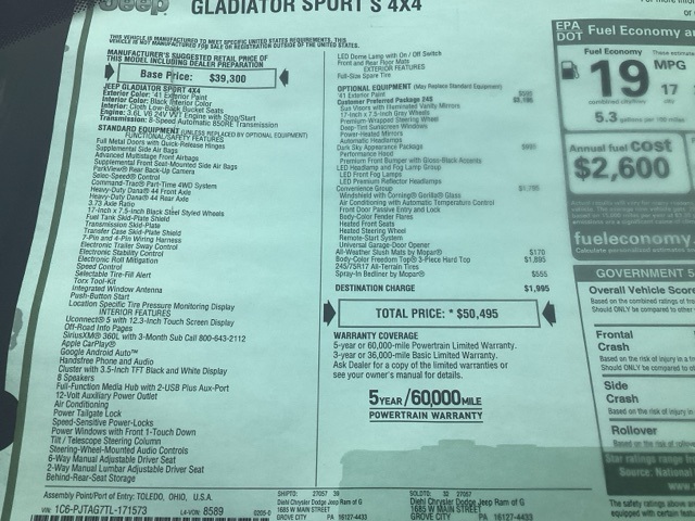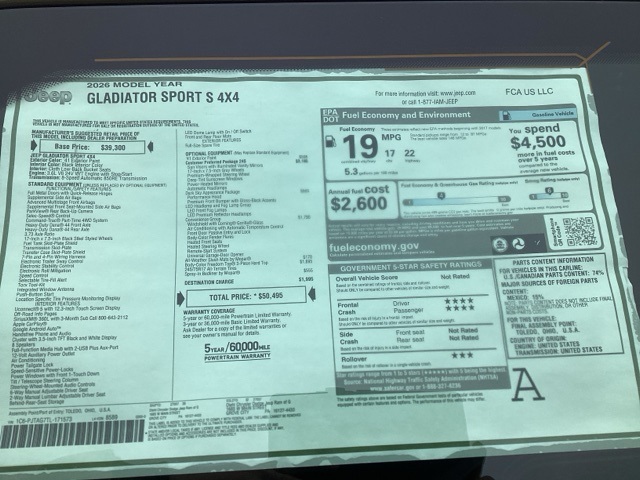 41 2026 Gladiator Jeep Sport S 4D Crew Cab 4WD 8-Speed Automatic 3.6L V6 24V VVT Price includes: $1000 - 2026 National Stellantis Loyalty Bonus Cash . Exp. 03/31/2026 $500 - 2026 National 2026 First Responder Bonus Cash . Exp. 01/04/2027