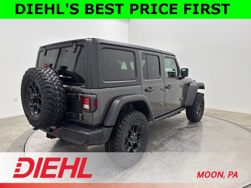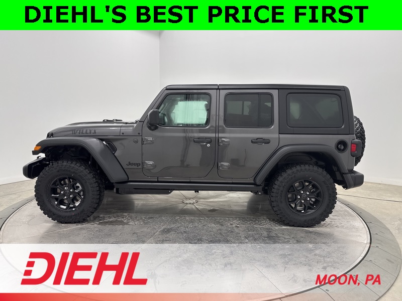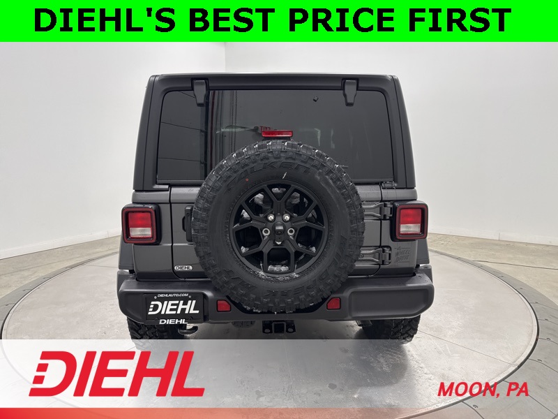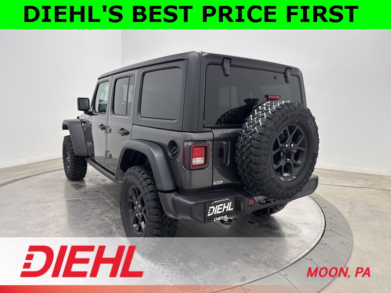 2-Door Passive Entry, Front Door Locks, 4-Wheel Drive Swing Gate Decal, 4.10 Rear Axle Ratio, 7 and 4 Pin Wiring Harness, Advanced Brake Assist, Air Conditioning with Auto Temp Control, Air Filtering, Automatic Headlamps, Auxiliary Switches, Black Grille with Gloss Black Rings, Class II Receiver Hitch, Cluster 7.0" TFT Color Display, Convenience Group, Conventional Differential Front Axle, Corning Gorilla Glass, Dana M210 Wide HD Tube Front Axle, Dana M220 Wide Rear Axle, Daytime Running Lamps LED Accents, Deep Tint Sunscreen Windows, Dual Top Group, E-Locker Rear Axle, Emergency/Assistance Call, Enhanced Adaptive Cruise Control, Front LED Fog Lamps, Full Speed Forward Collision Warning Plus, Heated Front Seats, Heated Steering Wheel, Injection Molded Black Rear Bumper, LED Premium Reflector Headlamps, Mold in Color Bumper with Gloss Black, Molded in Color Rubicon Highline Flare, MOPAR All-Weather Floor Mats, Off-Road Plus Mode, Power Dome Dual Vented Hood, Power Heated Mirrors, Premium Black Sunrider Soft Top with Dual Top Group, Premium Wrapped Steering Wheel, Quick Order Package 24W Willys, Security Alarm, Steel Power Dome Hood Package, Sun Visors with Illuminated Vanity Mirrors, Universal Garage Door Opener, Wheels: 17" x 7.5" Painted Black, Willy's Suspension, Willys Hood Decal.