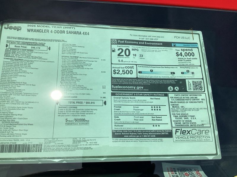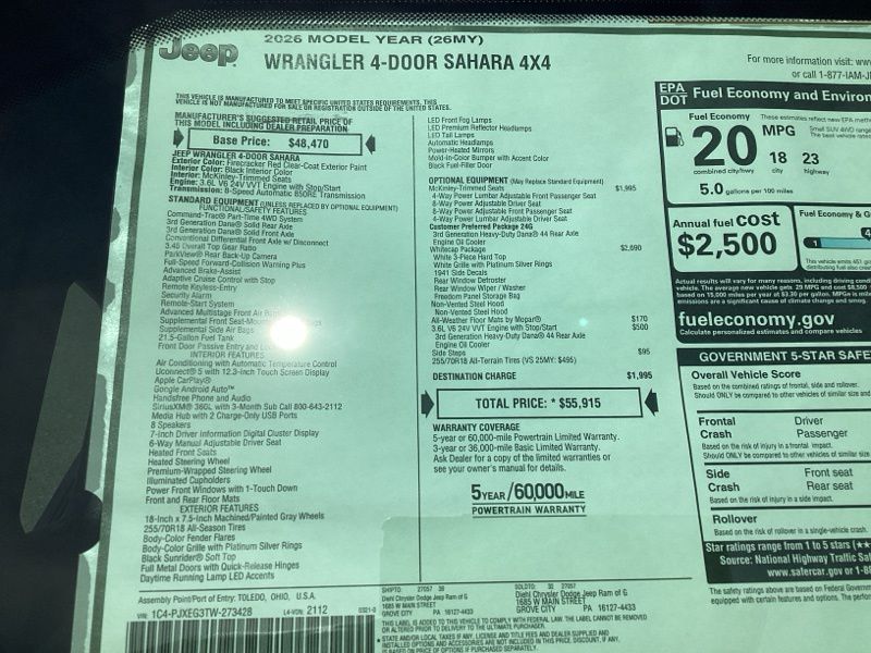 Firecracker Red Clearcoat 2026 Wrangler Jeep Sahara 4D Sport Utility 4WD 8-Speed Automatic 3.6L V6 24V VVT Price includes: $1000 - 2026 National Retail Bonus Cash . Exp. 04/30/2026 $1000 - 2026 National Stellantis Loyalty Bonus Cash . Exp. 04/30/2026 $500 - 2026 National 2026 First Responder Bonus Cash . Exp. 01/04/2027