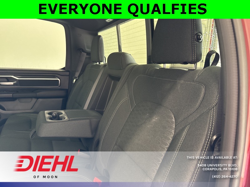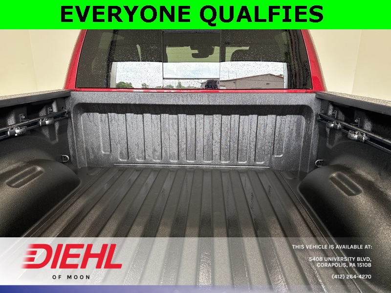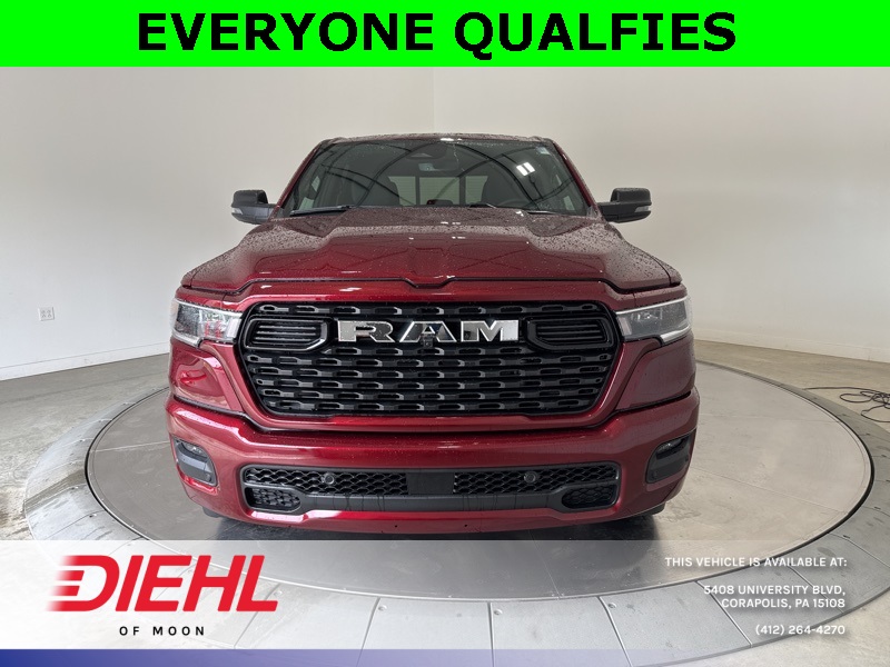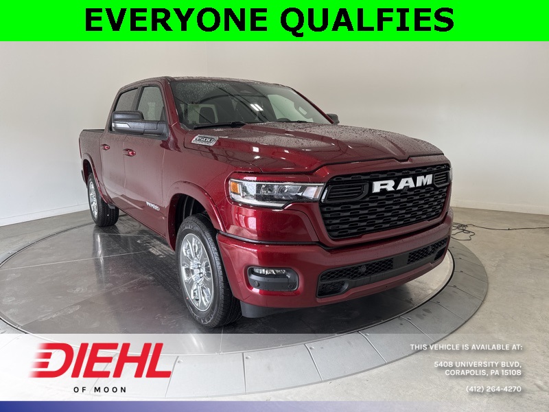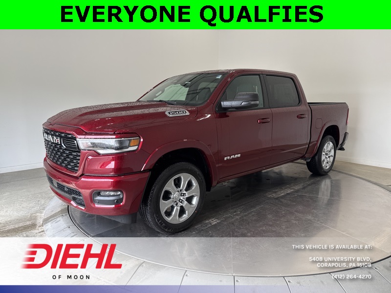 Introducing the 2026 Ram 1500 Big Horn Crew Cab 4x4 in striking Delmonico Red the perfect fusion of muscle, technology, and all-day comfort. Now available at Diehl Chrysler Dodge Jeep Ram in Moon Township, PA, this full-size pickup delivers everything Pittsburgh drivers need to work smarter, play harder, and ride in total style.Beneath the hood roars the all-new 3.0L Hurricane I6 twin-turbo engine with Stop/Start, paired to an 8-speed automatic 8HP75 transmission. Whether youre towing across Allegheny County, commuting through Robinson Township, or headed off-road for the weekend, this truck brings next-level torque, power, and refinement.Inside the Crew Cab, youll find black cloth bucket seats, a power 10-way driver seat, and heated front seats paired with a heated steering wheel for those frosty Pennsylvania mornings. The massive 12-inch Uconnect touchscreen provides seamless control with Apple CarPlay, Android Auto, SiriusXM 360L, voice command, and Ram Connected Services. A 7-inch digital driver display puts all vital stats front and center.The Customer Preferred Package 21Z and Level 2 Equipment Group load this Big Horn with premium features like dual-zone automatic climate control, remote start, 115V outlets, front/rear floor mats, rear in-floor storage bins, power-adjustable pedals, and rear dome lighting. The Bed Utility Group includes LED bed lighting, a deployable bed step, and spray-in Mopar bedliner, making it easy to load, haul, and get the job done.Aesthetically, this truck turns heads with body-color bumpers, chrome-clad 20-inch wheels, and sharp LED exterior lighting. It also boasts an anti-spin differential rear axle, trailer brake controller, and 3.92 rear axle ratio for towing confidence. Youre not just pulling weight youre pulling away from the competition.With a total price of $62,510, the 2026 Ram 1500 Big Horn Crew Cab 4x4 is one of the best full-size truck values in the Pittsburgh market and it comes backed by Rams 5-year/60,000-mile powertrain warranty and 3-year/36,000-mile bumper-to-bumper coverage.Ready to upgrade to a truck that delivers both performance and presence? Visit Diehl of Moon today or schedule your test drive before this Delmonico Red powerhouse is gone. Price includes: $3500 - 2026 National Retail Consumer Cash . Exp. 09/30/2025