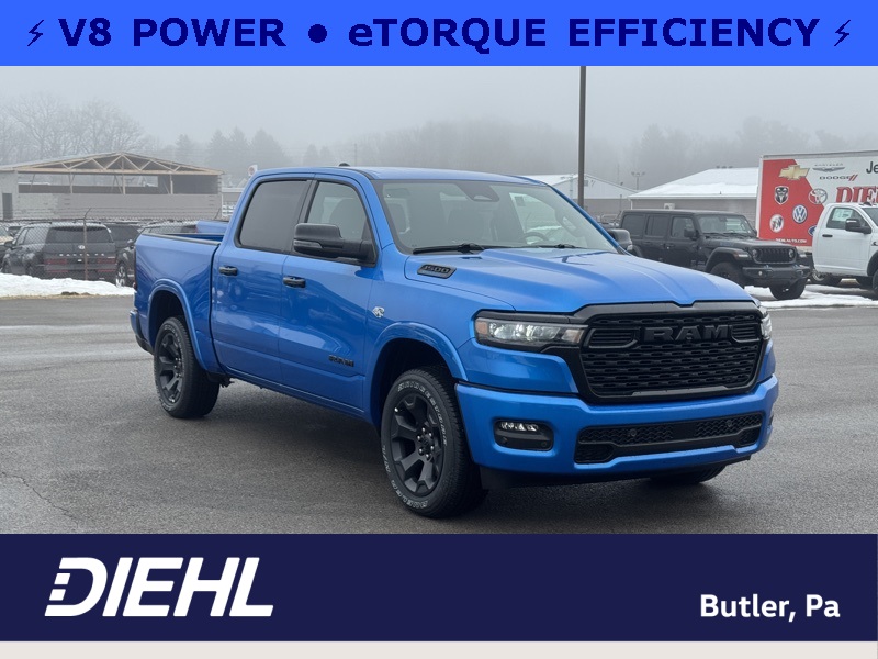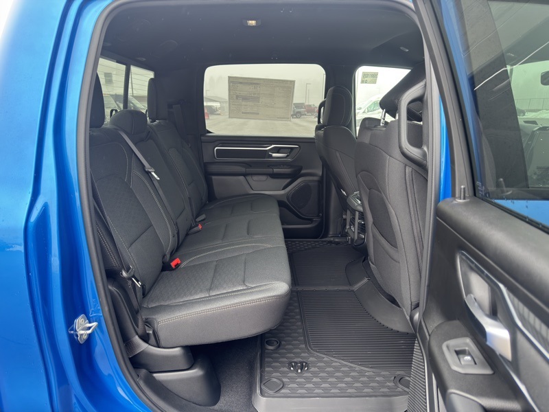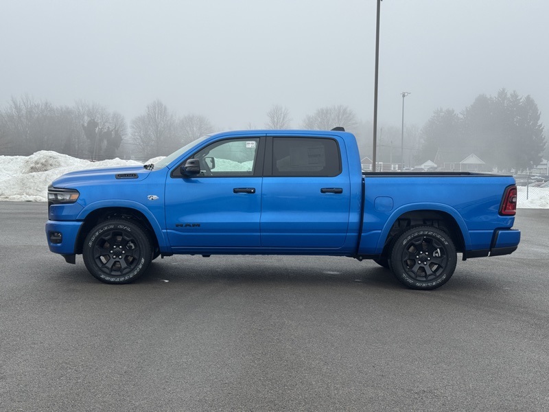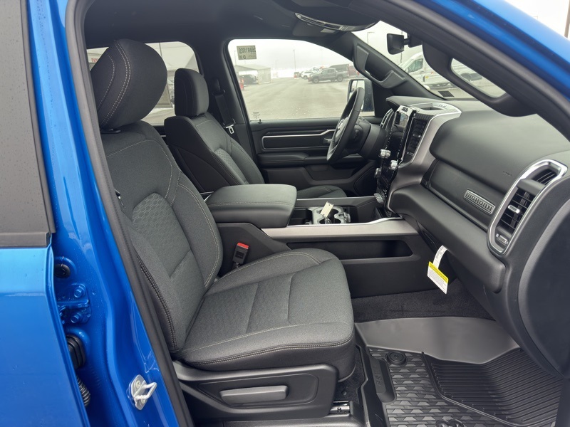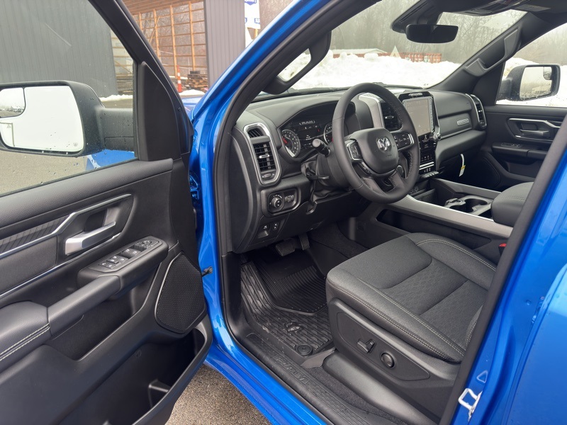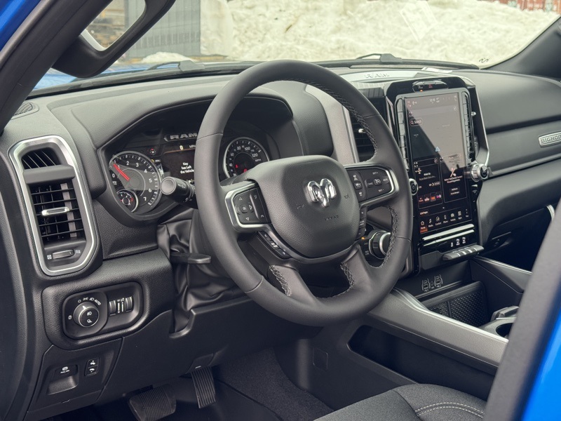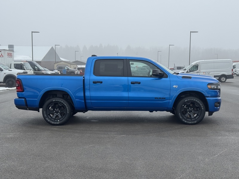 Big Horn Level 2 Equipment Group (115V Auxiliary Power Outlet, 115V Auxiliary Rear Power Outlet, 12" Touchscreen Display, 2nd Row in Floor Storage Bins, 3 Rear Seat Head Restraints, 4 Way Front Headrests, 400W Inverter, 4G LTE Wi-Fi Hot Spot, 9 Amplified Speakers with Subwoofer, Air Conditioning ATC with Dual Zone Control, Apple CarPlay, Auto Power-Folding Mirrors, Auto-Dimming Exterior Driver Mirror, Auto-Dimming Rear-View Mirror, Black Exterior Mirrors, Black Premium Power Mirrors, Body Color Fender Flares, Bucket Seats, Center Console Parts Module, Cluster 7.0" TFT Color Display, Configurable Drive Mode, Connected Travel and Traffic Services, Connectivity - US/Canada, Convex Wide-Angle Exterior Mirror Insert, Deluxe Cloth Bucket Seats, Disassociated Touchscreen Display, Exterior Mirrors Courtesy Lamps, Exterior Mirrors with Heating Element, Exterior Mirrors with Supplemental Signals, Front Seat Back Map Pockets, Full Length Floor Console, Global Telematics Box Module, Glove Box Lamp, Google Android Auto, GPS Antenna Input, GPS Navigation, HD Radio, Heated Front Seats, Heated Steering Wheel, Integrated Center Stack Radio, Integrated Voice Command with Bluetooth, Leather Wrapped Steering Wheel, LED Dome Lamp with on/Off Switch, LED Footwell Lighting, Manual Adjust 4-Way Front Passenger Seat, Media Hub with 2 Charge Only USBs, Overhead LED Lamps, Power 2-Way Driver Lumbar Adjust, Power Adjust 8-Way Driver Seat, Power Adjustable Pedals, Premium Overhead Console, Radio: Uconnect 5 Navigation with 12.0" Display, Rear 60/40 Folding Seat, Rear Center Armrest, Rear Power Sliding Window, Rear Window Defroster, Remote Tailgate Release, Security Alarm, SiriusXM Radio Service, SiriusXM with 360L, Steering Wheel Mounted Audio Controls, Sun Visors with Illuminated Vanity Mirrors, Universal Garage Door Opener, and USB Host Flip), Night Edition (Accent Color Door Handles, Accent Color Premium Power Mirrors, Accent Color Tailgate Handle, Anti-Spin Differential Rear Axle, Black Exterior Truck Badging, Black Headlamp Bezels, Black Interior Accents, Black Painted Exterior Mirrors Caps, Black Tail Lamp Bezels, Body Color Front Bumper, Body Color Rear Bumper with Step Pads, Dual Exhaust with Black Tips, Grille Black Surround Black Mesh, RAM Grille Badge - Black, and Wheels: 20" x 9.0" Aluminum Painted Clad), Quick Order Package 27Z Big Horn, 4-Wheel Disc Brakes, 48V Belt Starter Generator, 6 Speakers, ABS brakes, Air Conditioning, Alloy wheels, AM/FM radio, Apple CarPlay/Android Auto, Auto High-beam Headlights, Brake assist, Bumpers: chrome, Cloth Bucket Seats, Compass, Delay-off headlights, Driver door bin, Dual front impact airbags, Dual front side impact airbags, Electronic Stability Control, Front anti-roll bar, Front Bucket Seats, Front Center Armrest w/Storage, Front fog lights, Front reading lights, Front wheel independent suspension, Fully automatic headlights, Heated door mirrors, Illuminated entry, Low tire pressure warning, Manual Adjust 4-Way Driver Seat, Manual Folding Exterior Mirrors, MOPAR Front and Rear Rubber Floor Mats, Occupant sensing airbag, Outside temperature display, Overhead airbag, Overhead console, Panic alarm, ParkView Rear Back-Up Camera, Passenger door bin, Passenger vanity mirror, Power door mirrors, Power steering, Power windows, Radio data system, Radio: Uconnect 5 W with 8.4" Display, RAM Grille Badge - Chrome, Rear anti-roll bar, Rear step bumper, Rear Wheelhouse Liners, Remote keyless entry, Speed control, Supplier Part Tracking (J-1), Tachometer, Telescoping steering wheel, Tilt steering wheel, Traction control, Trip computer, Variably intermittent wipers, and Voltmeter. Hydro Blue Pearlcoat 2026 Ram 1500 Big Horn/Lone Star 4WD 8-Speed Automatic HEMI 5.7L V8 Multi Displacement VVT eTorque