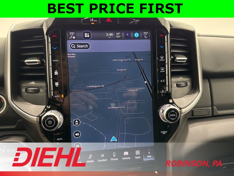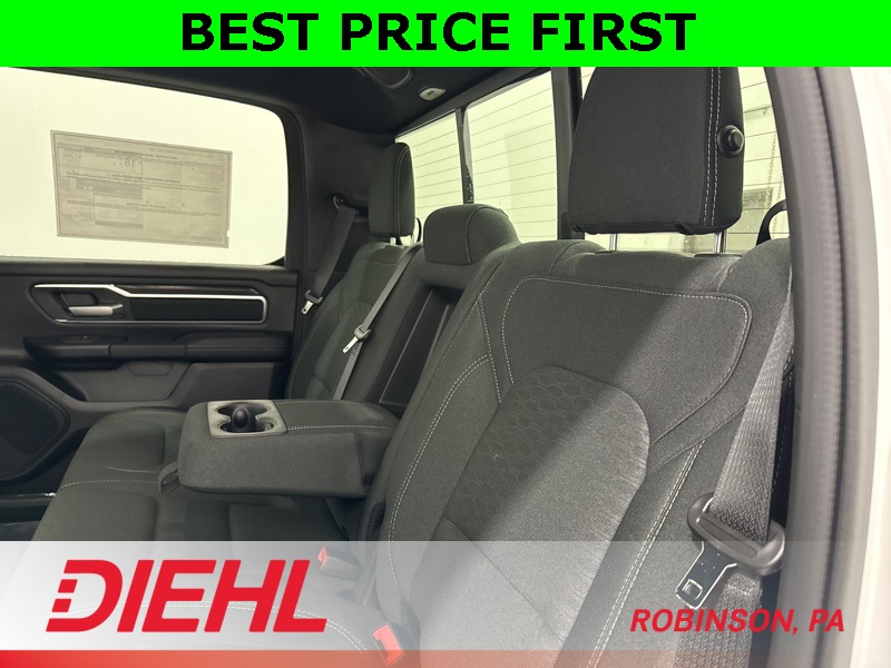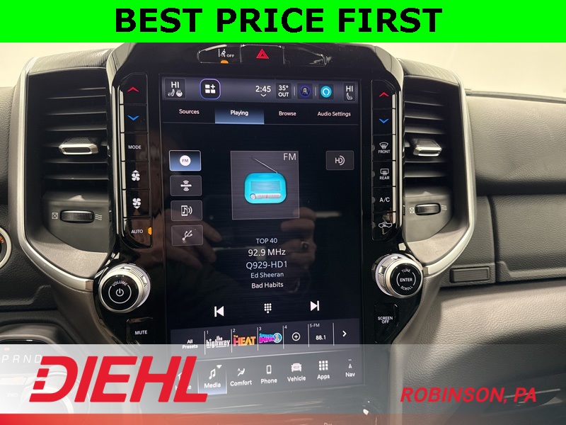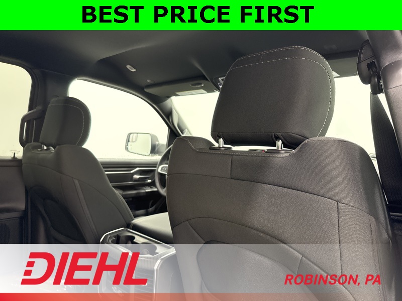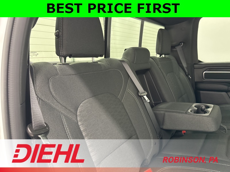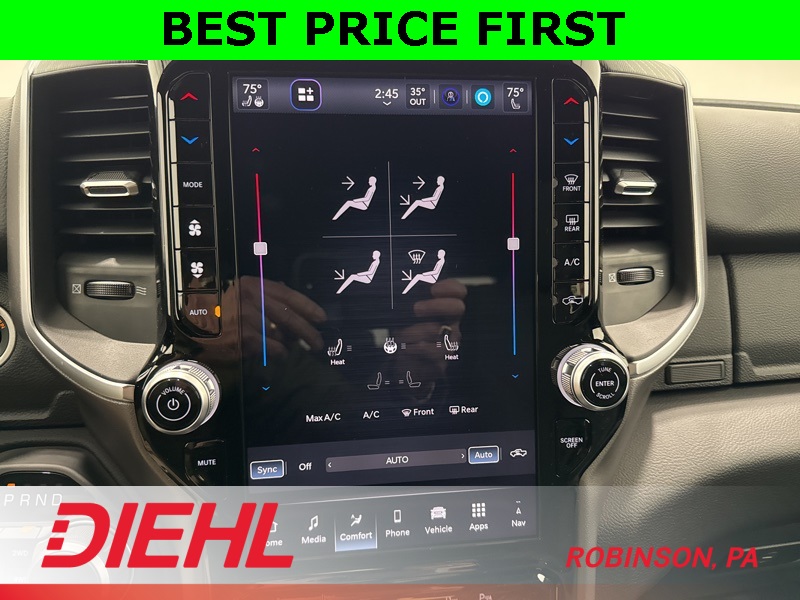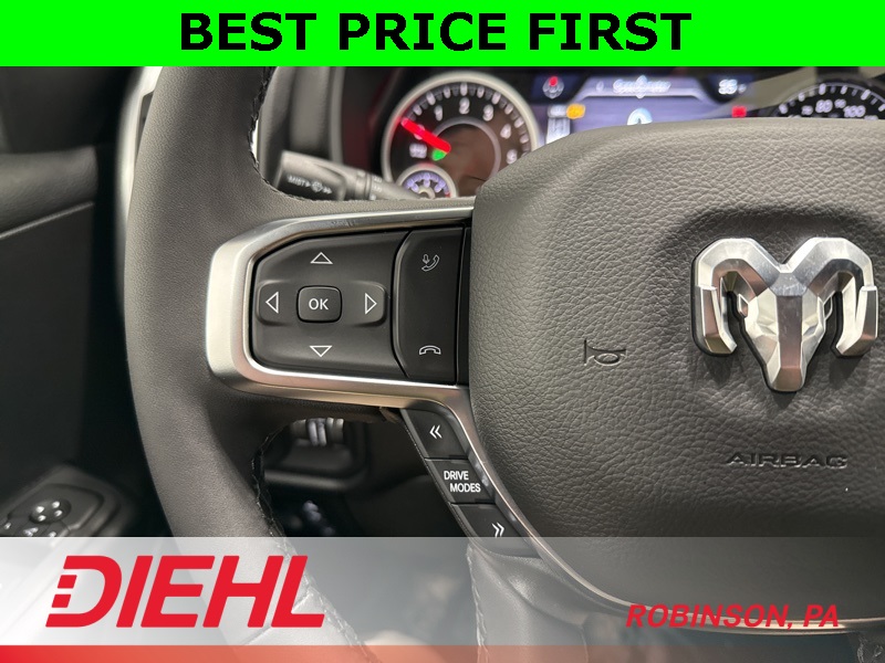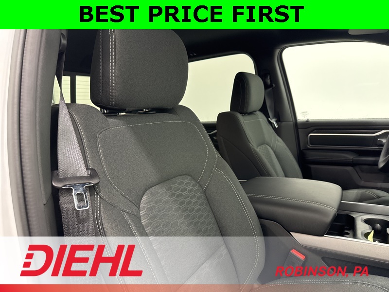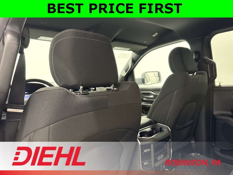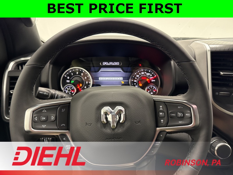 Inside, this Big Horn strikes a perfect balance between comfort and capability. The Crew Cab layout gives you real, adult-friendly rear seat space, while the cloth interior, power driver seat, and heated front seats make it easy to settle in for longer drives. The large touchscreen with Apple CarPlay and Android Auto keeps everything simple and intuitive, and the digital gauge cluster adds a modern touch without overcomplicating things. This is a truck that’s comfortable enough for commuting but still feels like a truck when you want it to.