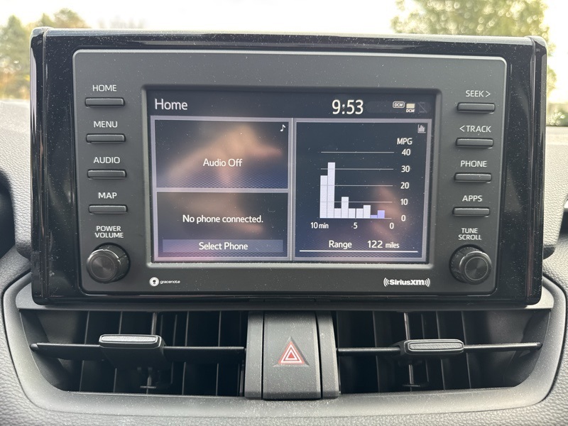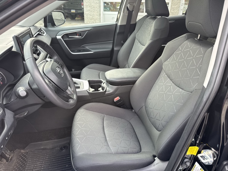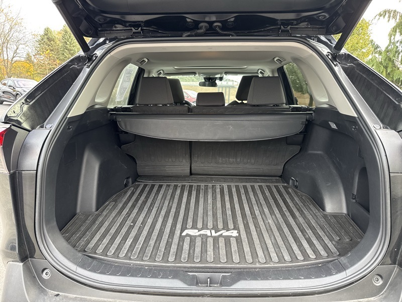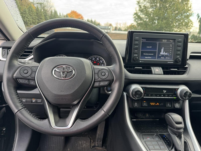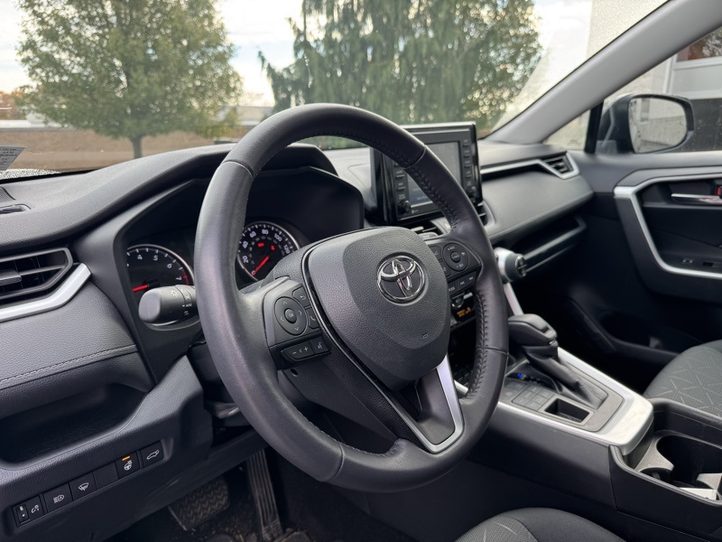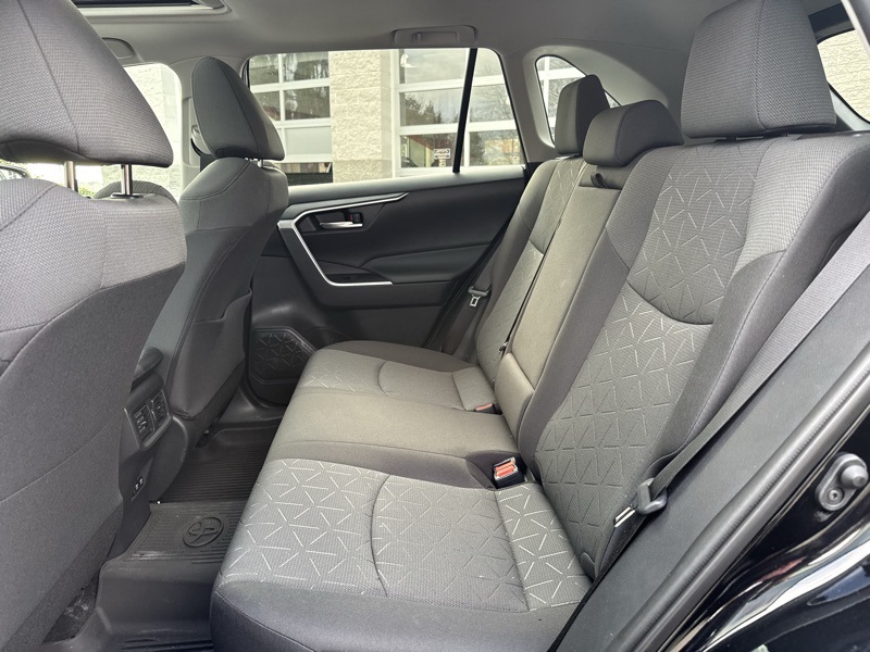 Midnight Black Metallic 2021 Toyota RAV4 XLE 4D Sport Utility AWD 2.5L 4-Cylinder DOHC Dual VVT-i 8-Speed Automatic All Weather Liner Package (TMS) (All Weather Floor Liners and Cargo Liner (TMS)), Convenience Package (Front Door Smart Key System w/Push Button Start and Tilt & Slide Moon Roof), XLE Grade Weather Package (3 Spoke Leather Heated Steering Wheel, Front Seat Heating, Rain Sensing Front Wipers, and Wiper Deicer), AWD, Black w/Fabric Seat Trim, 4-Wheel Disc Brakes, 6 Speakers, ABS brakes, Air Conditioning, Alloy wheels, AM/FM radio: SiriusXM, AM/FM Stereo, Apple CarPlay/Android Auto, Auto High-beam Headlights, Automatic temperature control, Axle Ratio: 3.177, Brake assist, Bumpers: body-color, Delay-off headlights, Driver door bin, Driver vanity mirror, Dual front impact airbags, Dual front side impact airbags, Electronic Stability Control, Emergency communication system, Exterior Parking Camera Rear, Fabric Seat Trim, Four wheel independent suspension, Front anti-roll bar, Front Bucket Seats, Front Center Armrest, Front dual zone A/C, Front fog lights, Front reading lights, Fully automatic headlights, Heated door mirrors, Illuminated entry, Knee airbag, Low tire pressure warning, Occupant sensing airbag, Outside temperature display, Overhead airbag, Overhead console, Panic alarm, Passenger door bin, Passenger vanity mirror, Power door mirrors, Power driver seat, Power steering, Power windows, Radio data system, Rear anti-roll bar, Rear seat center armrest, Rear window defroster, Rear window wiper, Remote keyless entry, Roof rack: rails only, Speed control, Speed-sensing steering, Split folding rear seat, Spoiler, Steering wheel mounted audio controls, Tachometer, Telescoping steering wheel, Tilt steering wheel, Traction control, Trip computer, Turn signal indicator mirrors, Variably intermittent wipers, and Wheels: 17" 5-Spoke Silver Alloy. Odometer is 50386 miles below market average! 27/33 City/Highway MPG